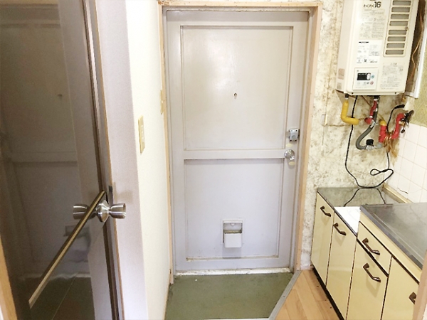 玄関してレトロ感が漂ってます。靴を脱ぐだけの必要最低限な広さ。