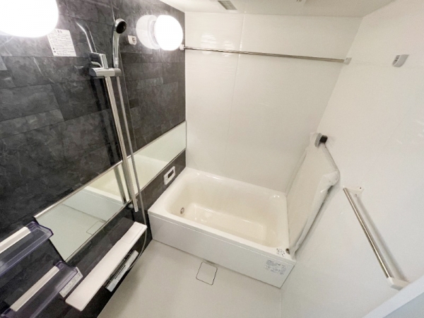 ブラックカラーの大理石調の壁で高級感のある雰囲気と