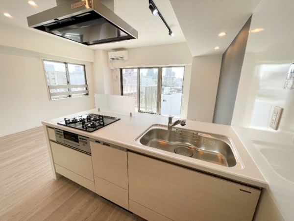 ガスコンロ3口+グリル付き、作業エリアも十分確保されています。