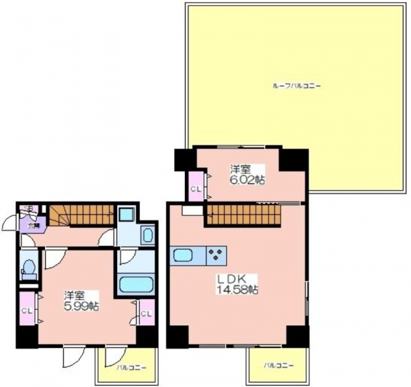 お部屋の外には、広すぎるルーフバルコニーが付いています。