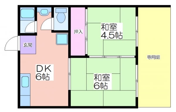 | 専用庭、室内洗濯機置き場、フローリング、給湯、洗面所独立、バス専用、バス・トイレ別、シャワー | |
