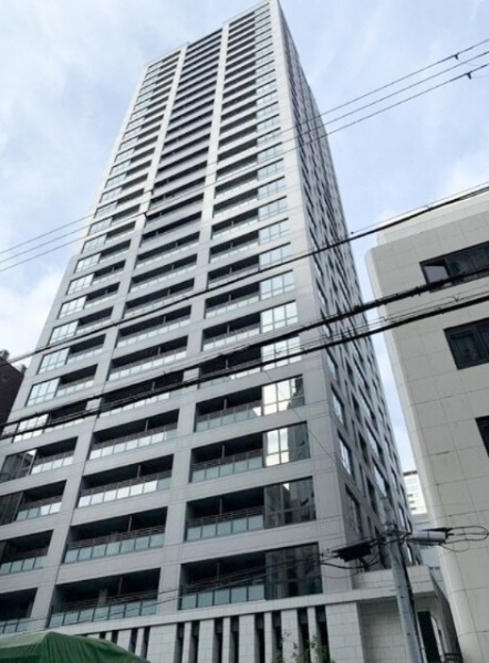 30階建てのタワマンで、グレーカラーの落ち着きのある外観になっています。