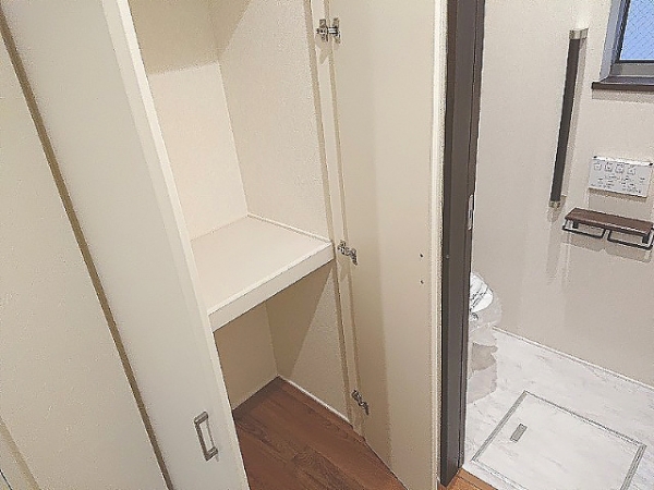 トイレの手前には、収納棚が設置されています。