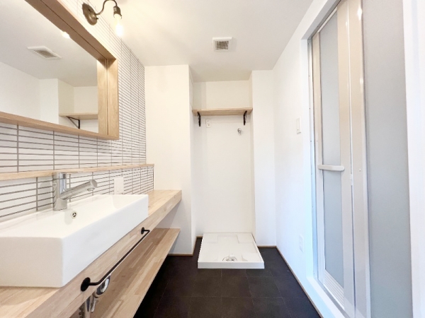 洗面脱衣所も、特注で作った感の長細い洗面台。