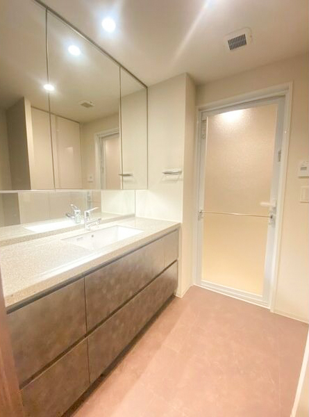 大きな洗面台があり、高級感あるデザインと大きな鏡がポイントです◎