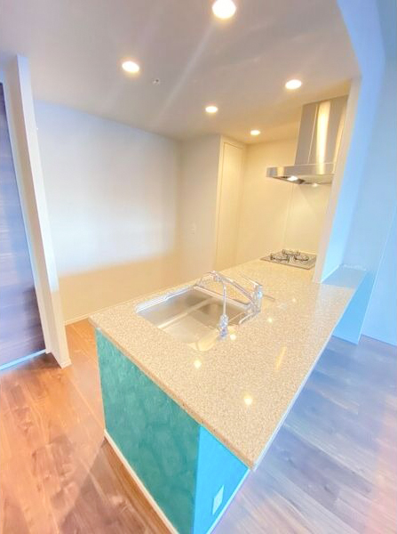 室内一番のポイントは、エメラルドグリーンが可愛いシステムキッチンです。