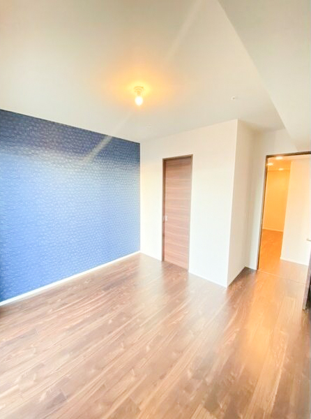 ブルーの壁紙がポイントの明るいお部屋になっています。