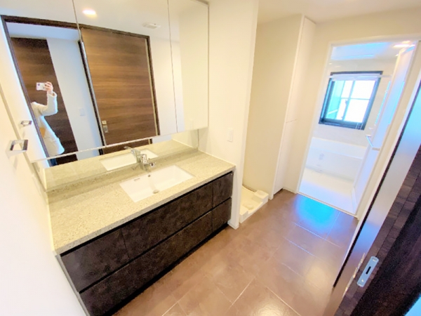 洗面台もワイドタイプで、大きめな三面鏡付き。
