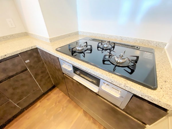 ビルドイン型のグリル付きの3口ガスコンロ。