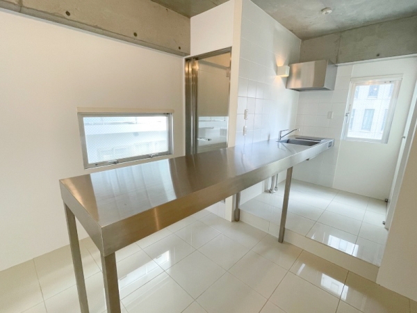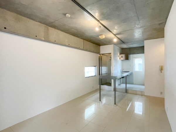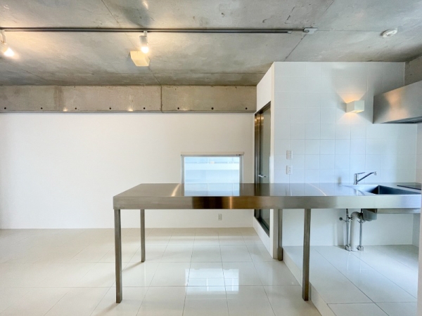 コンクリート打ちっ放しな天井とホワイトタイルの床という