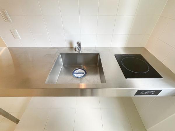 ステンレスデザイとホワイトタイルがお洒落なキッチン周りです。