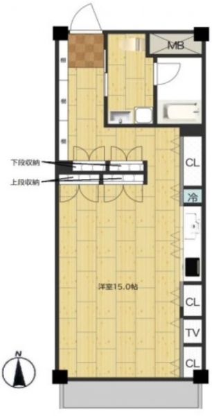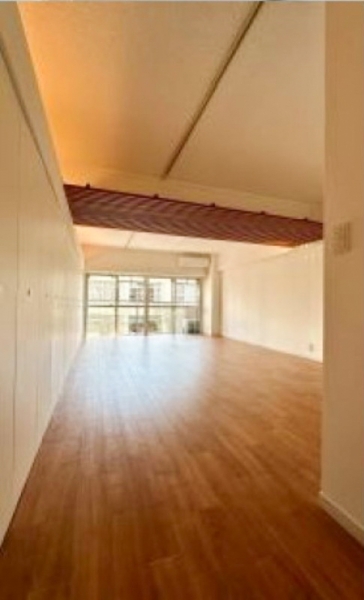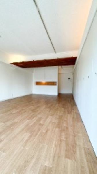 お洒落な木目調で、15帖のビッグワンルームになっています。