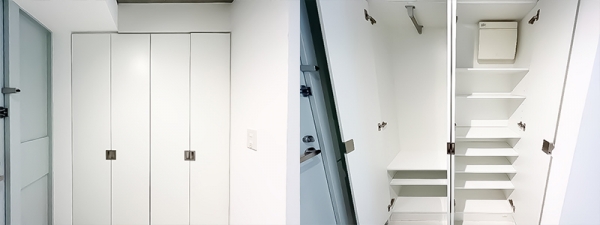 エアコンもしっかり備え付けで、こちらにも収納棚有り。