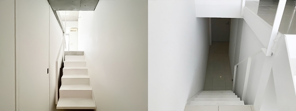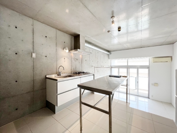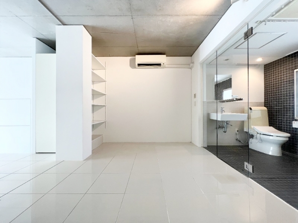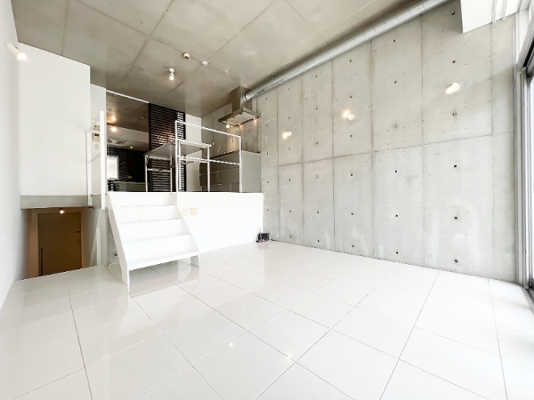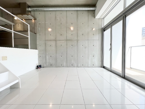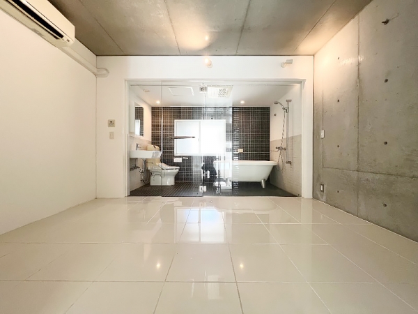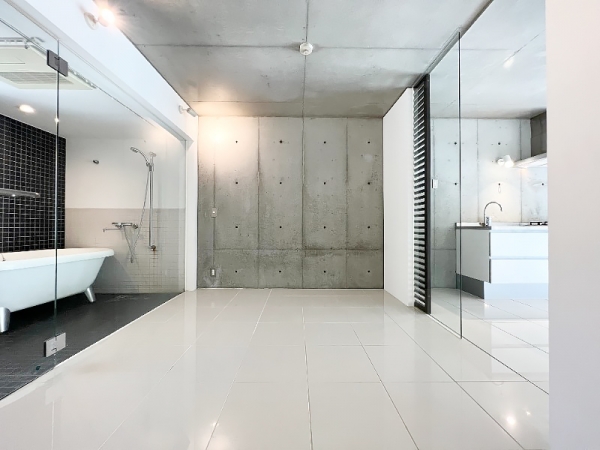 白いタイルの床とコンクリ打ちっ放しの壁など