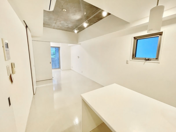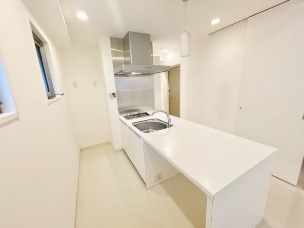 アイランドキッチンのあるホワイトな部屋。