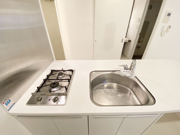 おしゃれなステンレス2口コンロと小ぶりなシンク。