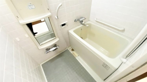 ホワイトタイルの明るい浴室です。