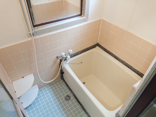 大きめタイルの昭和レトロなバスルーム。