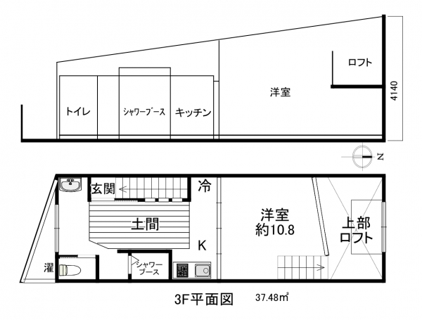 約10.8帖のロフト付き洋室にキッチンエリア+土間。