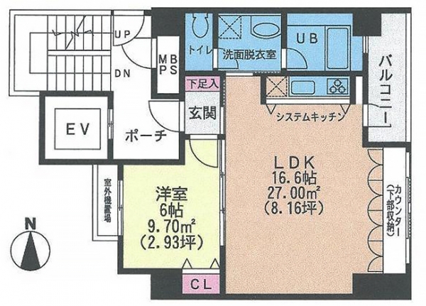 お部屋は5Fに位置する1LDK(53.5平米)と広々空間。