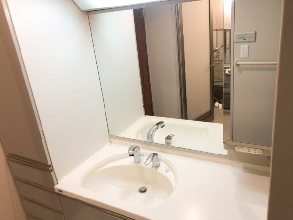 洗面台は、大きな鏡と広々した台エリアがポイント!