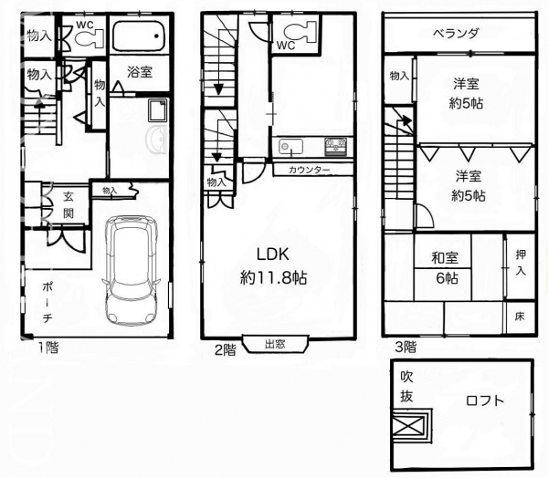 LDK11.8帖と5帖の洋室2つと6帖の和室という