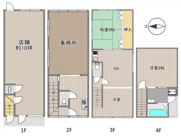 1Fには10坪の店舗、2Fは事務所、3F以降は