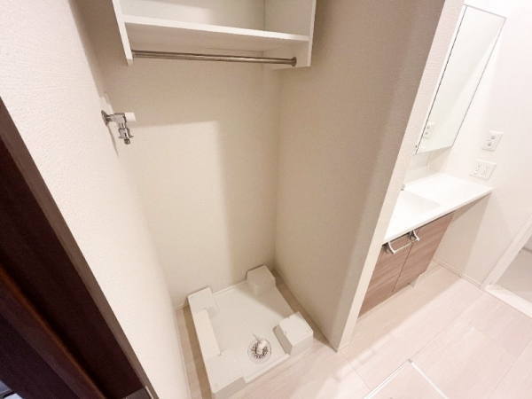 洗濯機置き場の上部には、棚とハンガーポールがあります。