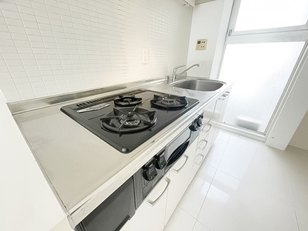 ガスコンロ3口・グリル付きなシステムキッチンです。