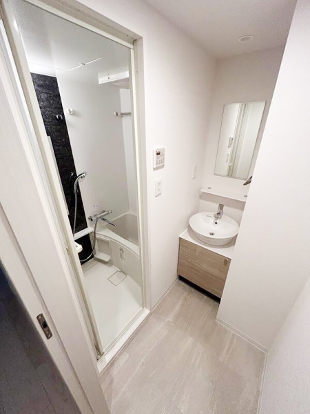 バスルームもシックな色がアクセントのシステムバス。