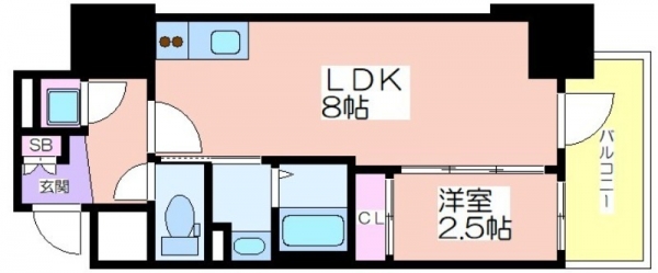 8帖のLDKと2.5帖の洋室からなる間取り。