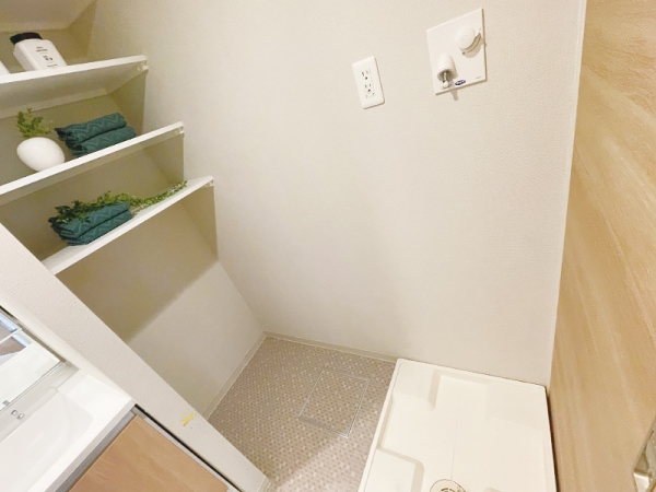 室内洗濯機置場も確保されており、横には棚収納付き。