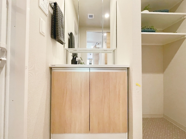 洗面台もナチュラルウッドとホワイトの組み合わせ。