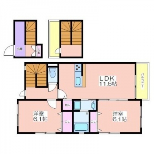 LDK11.6帖と洋室6.1帖が2つという間取り。