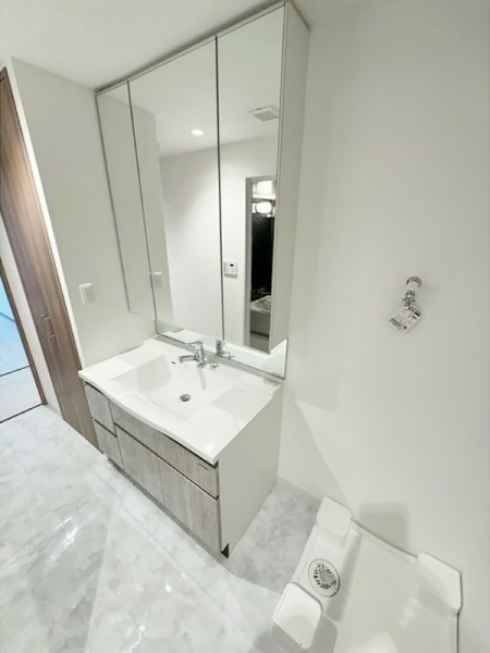洗面台もワイドで鏡裏にも収納のある三面鏡仕様。
