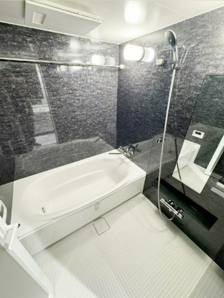 バスルームも高級感あふれる石タイル風デザインで