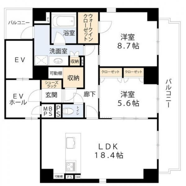 LDK18.4帖、洋室8.7帖と5.6帖+水回りからならる間取り。