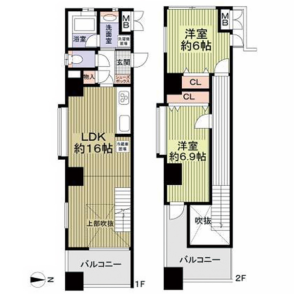 1Fがリビング約16帖、2Fが約6帖と約6.9帖の洋室2つで
