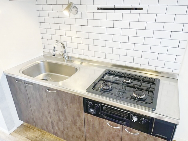 グリル付きのビルドイン3口ガスコンロが設置されており