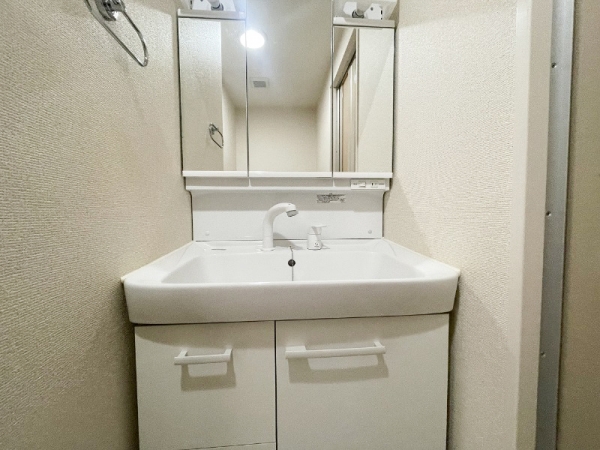 洗面台は、ホワイトカラーのシンプルなデザインで、