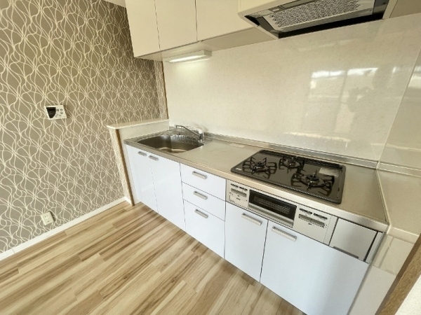 システムキッチンは、ガスコンロ3口・グリル付きとしっかり設備です。