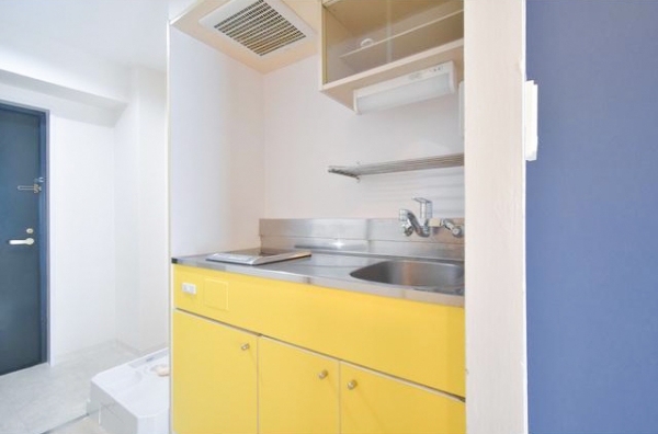 鮮やかな黄色がかわいいシステムキッチンです。