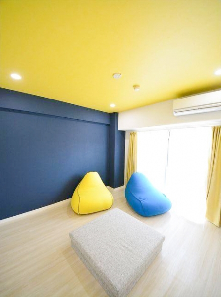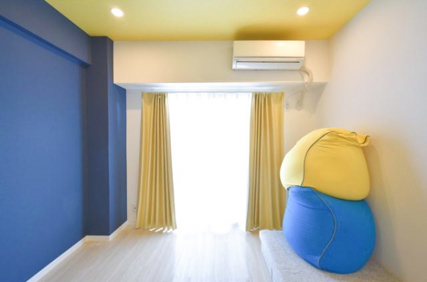 ビビッドなブルー壁とイエローな天井がかわいいお部屋になっています。