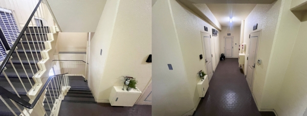 共用廊下は、ダークグレーとホワイトのシンプルなデザインです。
