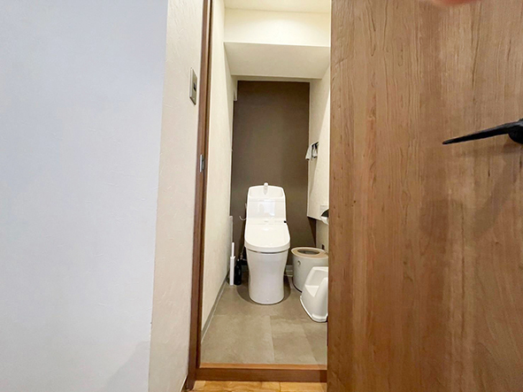 お手洗いの壁一面がブラックなアクセント壁になっています。