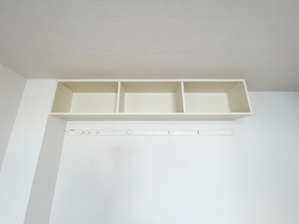 壁には、3エリアに区切られた棚とウォールフックが付いています。