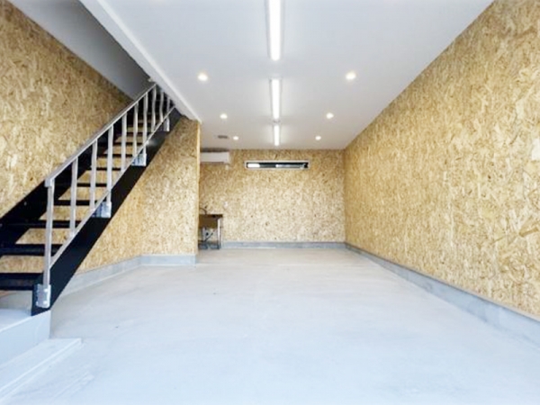 パーティクルボードで覆われた奥行きの広いガレージ。