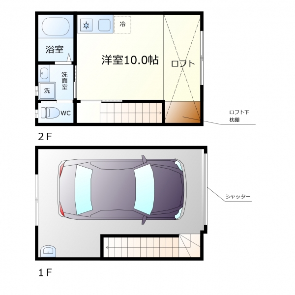 1Fがガレージ、2Fが洋室10帖+ロフト付きという間取り。