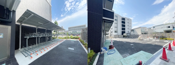 こちらは、共用エリアにある駐車場と駐輪場です。