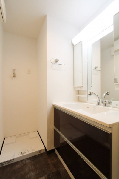 こちらは大きな鏡が特徴の洗面台がある洗面脱衣所で、